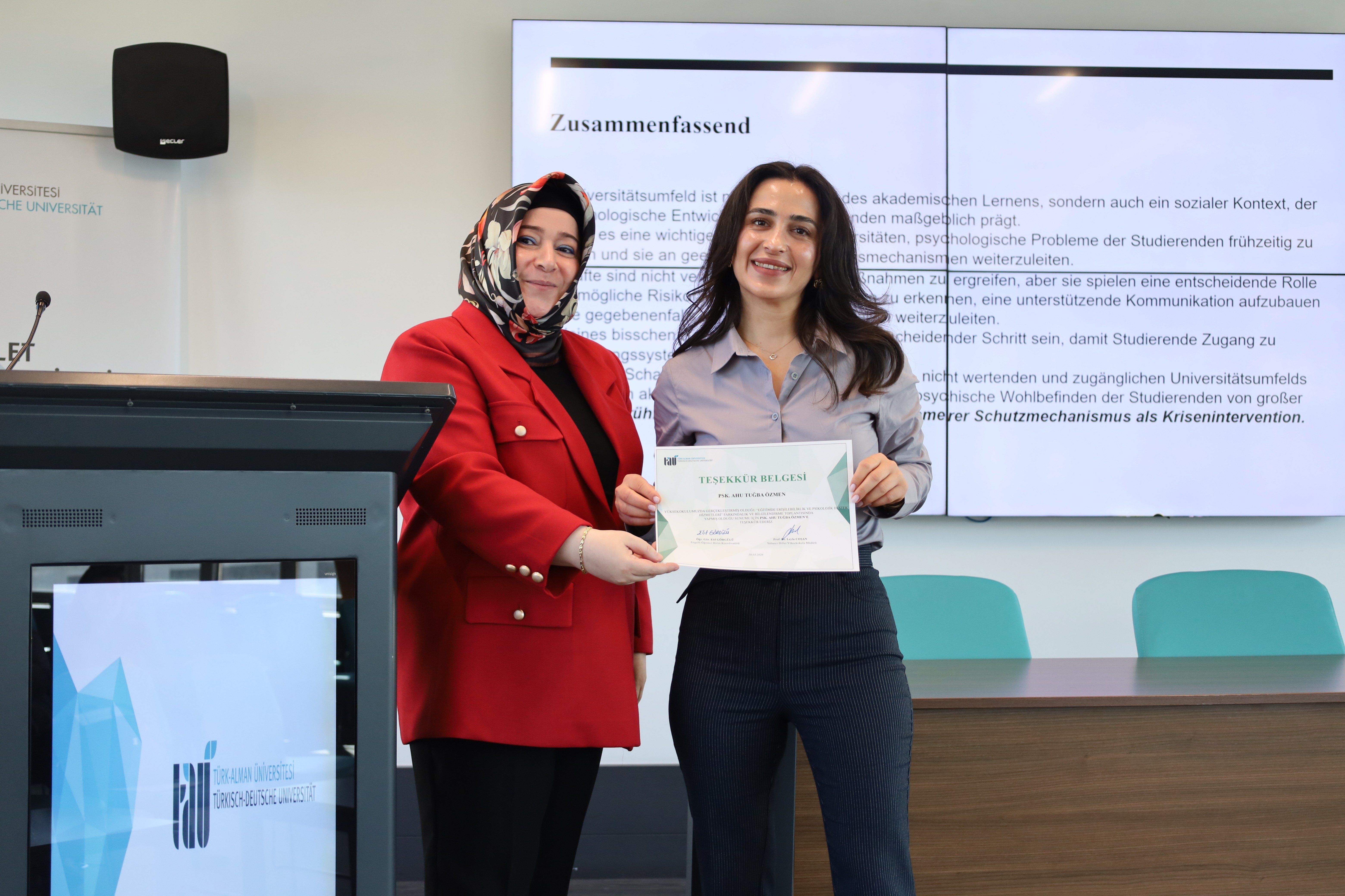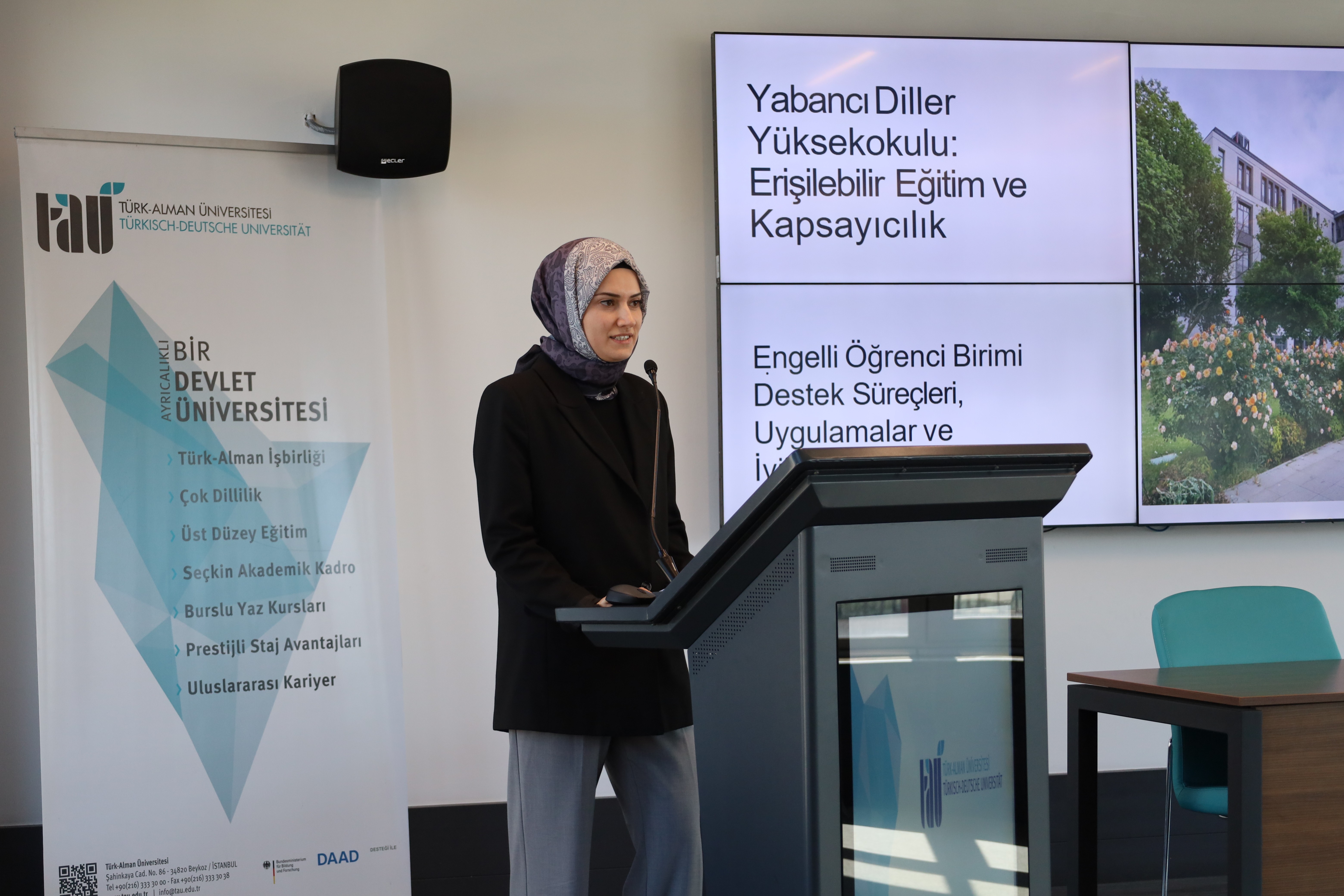 Im letzten Teil der Veranstaltung hielt Ahu Tuğba Özmen, Psychologin an der Türkisch-Deutschen Universität, einen Vortrag mit dem Titel „Behinderung und psychische Fragilität: Risikodynamiken im universitären Umfeld“. In ihrem Vortrag wies Özmen auf die psychischen Probleme hin, mit denen Studierende konfrontiert sein können, sowie auf die psychologischen Risikodynamiken, die im universitären Umfeld auftreten können, und betonte, wie wichtig es ist, das Bewusstsein für diesen Bereich zu schärfen.